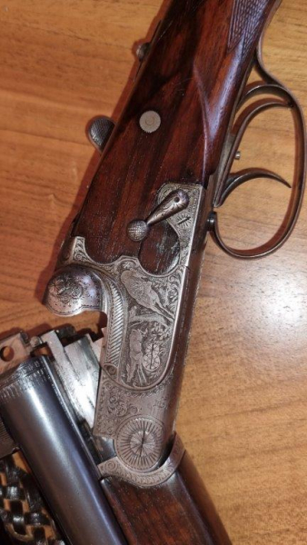 Die Waffe hat beidseitig eine sehr schöne Gravur. Auf der einen Seite Hund, auf der anderen Seite Rehe.