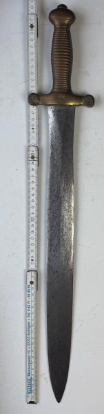 Frankreich - Infanterie Faschinenmesser: M 1831, Messinggefäss, schwere zweischneidige Klinge, auf der Parierstange mit Hersteller oder Truppenkennzeichen. Klingen-Länge: ca. 47,5cm., Gesamt-Länge ca. 63cm.:, Klingen-Breite: ca. bis zu 43mm., ohne Lederscheide, gebrauchtes Stück.