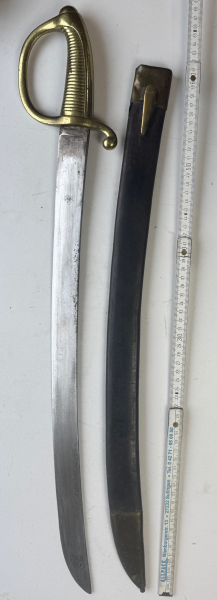 Säbel Briquet Frankreich, mit der dazugehörigen Scheide, diese ist an beiden Enden gestempelt, Messinggefäss ebenfalls gestempelt. Gesamt-Länge ca. 74cm., Klingen-Breite: ca. bis zu 34mm., mit leichten Altersspuren, gebrauchtes Stück.