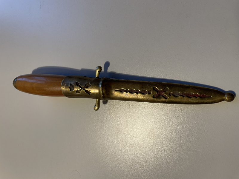 Die Messerscheide aus Messing hat leider eine Lötstelle die etwa 5 cm aufgegangen ist.Solte jemand löten können, sicher kein Problem