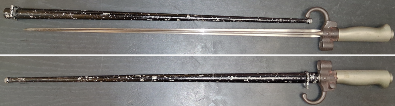 Bajonett „Lebel“ M 1886 WW1 mit Scheide. Französisch. Kreuzklinge. Gebogene Parierstange. Klingenlänge 52cm. Gesamt 65,5cm. Guter Zustand. Ab 18.