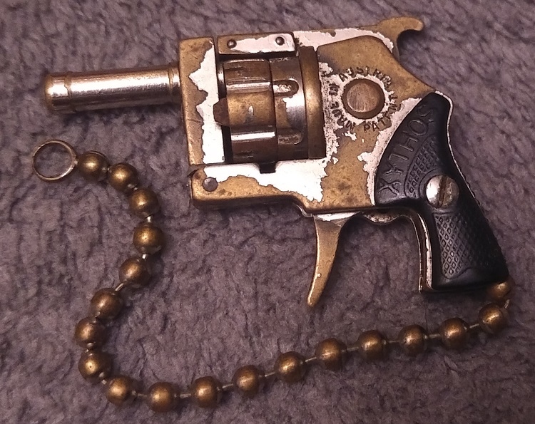Sie bieten auf einen der gesuchten Xythos Revolver, den kleinsten schußfähigen Revolver, welcher in Serie hergestellt wurde! Kaliber 2 mm Knall mit Stiftzündung. Dieses Revolver-Modell wurde von der kleinen österreichischen Uhrenmacher-Firma Andres & Dworsky in Uhrmacher-Qualität in Handarbeit hergestellt! Leider wird dieses Qualitätsprodukt seit einigen Jahren nicht mehr produziert. Ein gesuchtes, ungewöhnliches Stück. Double Action Abzug, 6 Schuß Trommelkapazität, Kipplaufmechanismus zum Laden, keinerlei Laufsperre! Baureihe mit PTB-Abnahme (PTB82), diese sehr frühe Schmuckausführung trägt aber keine PTB-Stempelung! Gegenstand der Auktion ist nur der Revolver, so wie er abgebildet ist, ohne weiteres Zubehör! Ausführung ohne Gewinde für einen Zusatzlauf.