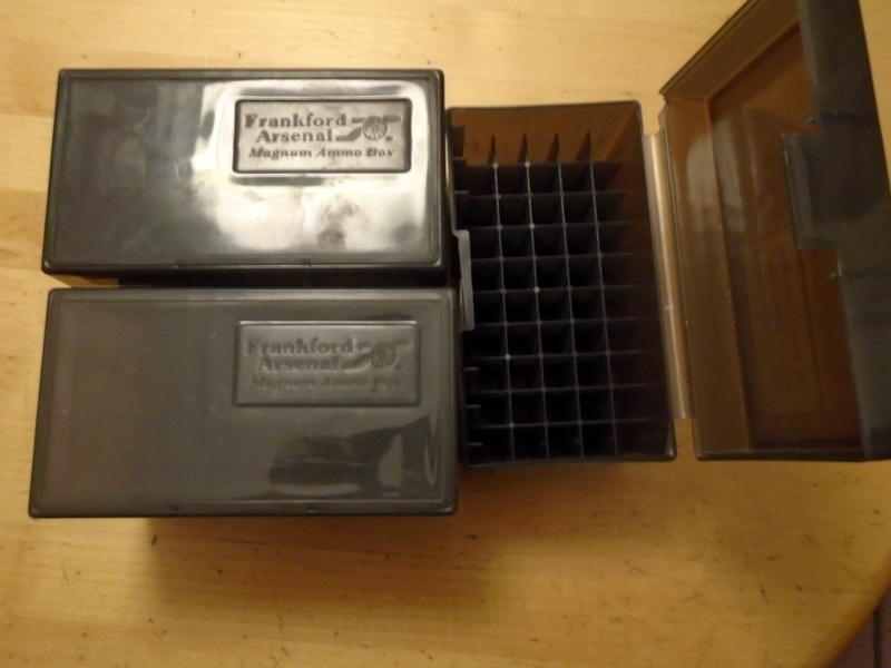Ich biete 3 Munitionsboxen von Frankford Arsenal für je 50 Patronen. Es passen .300 Win-Mag, 7mm Rem-Mag, und ähnliche. Die Boxen sind tadellos mit nur geringen Gebrauchsspuren. Bei weiteren Fragen bitte mailen.
