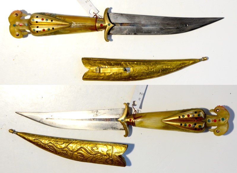 Kleiner Krummdolch mit messingummantelter Holzscheide und Horngriff, Klingenlänge 11,7 cm, Horngriff mit Applikationen aus Messing und Kunststoff(?), sehr alte und kaum auffällige Insektenfrassstellen am oberen Griffteil.