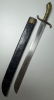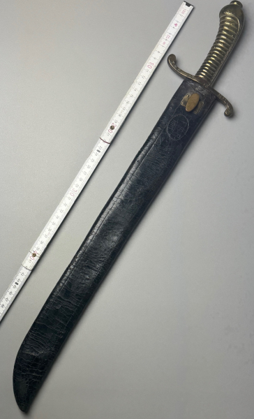 Preussen,Faschinenmesser Modell 1787 neuer Art, Messinggefäss, auf der Parierstange mit Hersteller oder Truppenkennzeichen. Klingen-Länge: ca. 48cm., Gesamt-Länge ca. 61,5cm.:, Klingen-Breite: ca. bis zu 38mm., mit Lederscheide, gebrauchtes Stück.