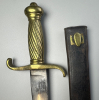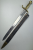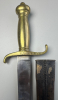 Preussen Artillerie Faschinenmesser M 1849, Messinggefäss, auf der Parierstange mit Hersteller oder Truppenkennzeichen. Der Klingenrücken ist ebenfalls gestempelt, Klingen-Länge: ca. 47,4cm., Gesamt-Länge ca. 67cm.:, Klingen-Breite: ca. bis zu 36mm., mit stärker gebrauchter Lederscheide.