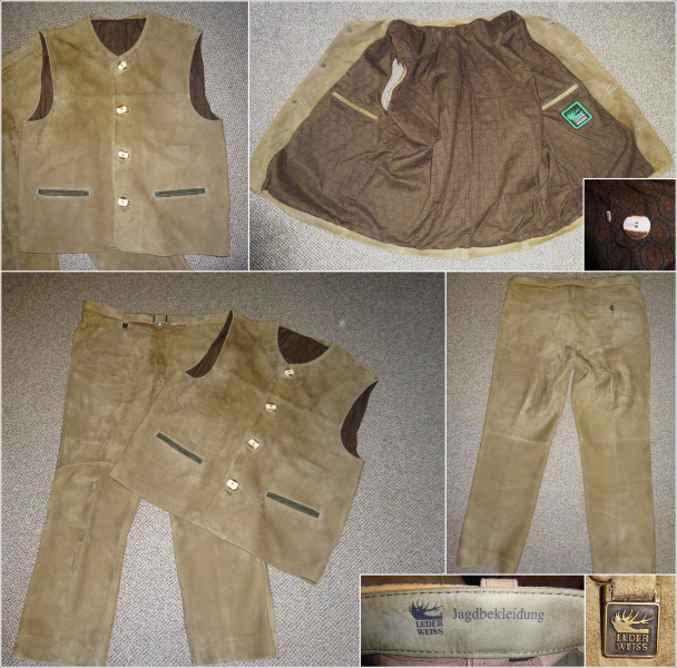 Lederhose und Weste aus dickem Hirschlder (sämisch gegerbt) für Jagd, Größe 27 / 52-54