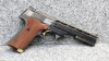 Griffstück: Anatomische Holzgriffschalen (oft mit Daumenauflage und Fischhaut) im "Military Style Grip" (ähnliche Handlage wie die M1911).
