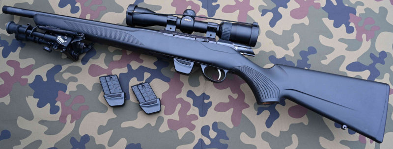 Ausgestattet mit tadellosem Nikon Prostaff 2-7 x 32 Zielfernrohr mit Absehen mit Absehen 8 in der zweiten Bildebene (vergrößert nicht mit) sowie einem verstellbarem Zeadio-Zweibein und insgesamt 3 Magazinen.