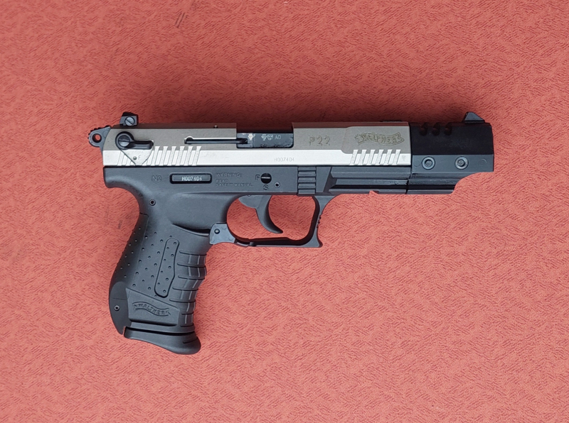 Halbautomatische Pistole von Hersteller "Walther", Mod. P22 / Kal.: .22lr / Lauflänge ist 127mm / sehr guter Gesamtzustand, kaum oberflächige Spuren erkennbar / vernickelter Schlitten / der Lauf ist innen blank /
