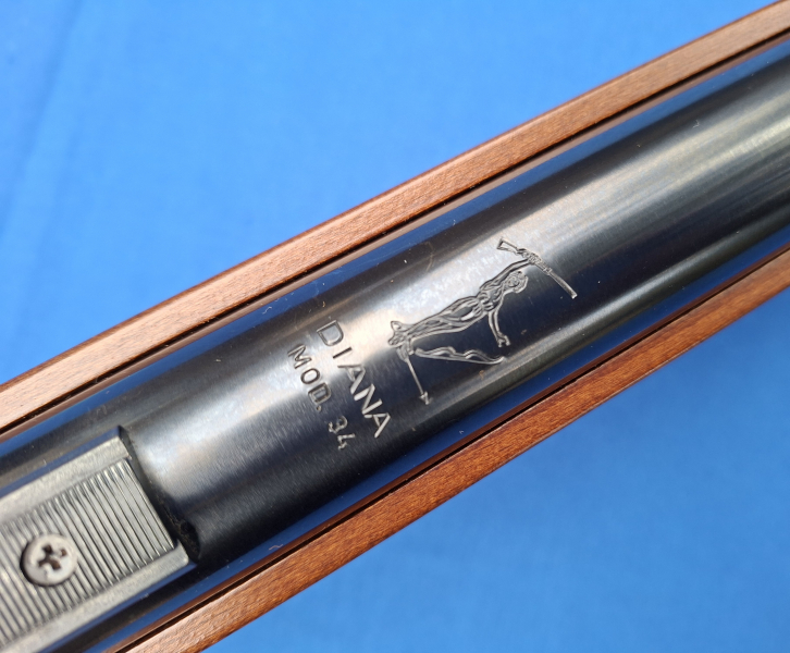 Sehr schönes Diana Modell 34, Kal.4,5. Baujahr 1992. F Zeichen. Komplett und original.Hat momentan ein Exportfeder verbaut, aber könnte auf Wünsch auch geliefert werden mit F-Feder.