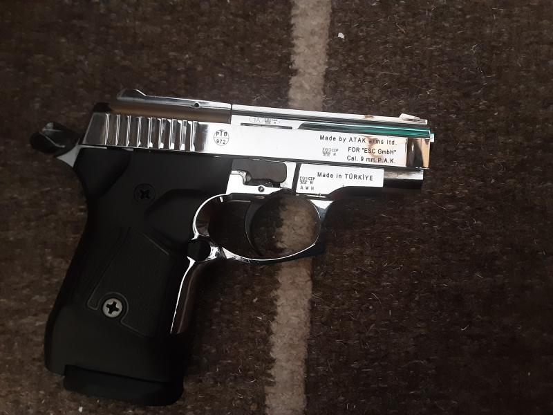 Selbstlade Pistole Zoraki 914, Kaliber 9mm PAK, PTB 972 in Shiny Chrome. Made in Türkiye. Tolle glänzende Oberflächen, lässt sich auf den Bildern nicht wiedergeben. Zum schießen eigentlich zu Schade.