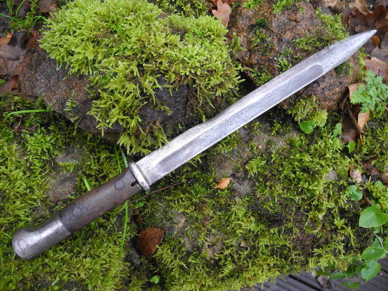 Versteigere aus meiner Sammlung ein wahrscheinlich preußisches Bajonett ohne Scheide, die Klinge ist geschliffen und poliert, rostnarbig, dto. die Metallteile am Griffstück, der Drücker funktioniert, Herstellermarken sind nicht mehr zu erkennen.