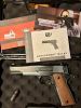 Biete hier einen NEUEN & UNGESCHOSSENEN Umarex Colt 1911 A1 ANT - WD im Kaliber 9mm P.A.K. Inkl aller Papiere , Abschussbecher und im Originalkoffer. PTB 774. Dies ist die limitierte, längst vergriffene Version im Antik- Finish mit Holzgriffschalen.