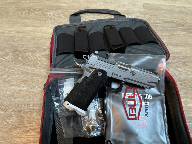 Sie bieten auf eine 2 Jahre alte Bul SAS ll Tac(2011) mit einer Lauflänge von 4,25“ im Kaliber.9mm Luger. Die Schussbelastung beträgt ca. 400 Schuss. Das Griffstück ist aus Stahl- kein Aluminium. Zur Auktion gehören 2 x 19 Schuss Magazine, Tasche, original Korn. Verkauf an Erwerbsberächtigte, nur innerhalb Deutschlands. Privatverkauf, keine Garantie oder Gewährleistung, keine Rücknahme.