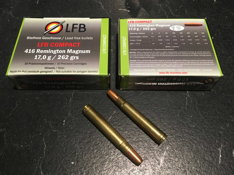 Aus dem Nachlass eines Freundes verkaufe ich zwei Packungen mit je 10 Patronen im Kaliber 416 Remington Magnum 17,0 g / 262 grs bleifrei vom Hersteller "Labor für Ballistik" (LFB) in ungeöffneter Originalverpackung. Bei Fragen bitte Email.
