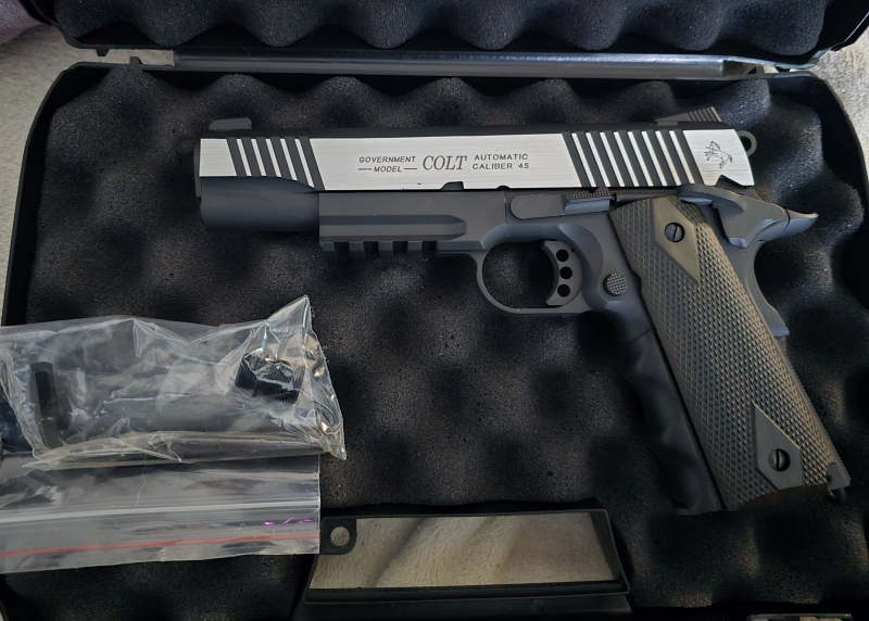 Hallo, biete hier von Colt eine 1911 rail gun in schwarz/silber, CO2, 6mmBB. Die waffe ist absolut neuwertig wurde probe geschossen, ist dicht. Keine gebrauchspuren. Sie hat Blowback. Mit dabei ein koffer, sechskantschlüssel, combatgriff Einlage und gewinde für z.b. schalldämpfer.