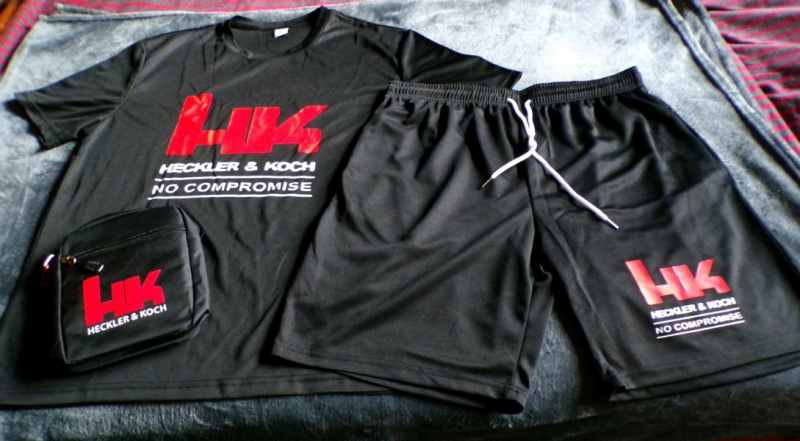 Im Angebot ! Neues Trikot mit " Heckler & Koch " Aufdruck. 2teilig: Shirt und kurzer Hose mit auffallendem "Heckler & Koch" Aufdruck. Eine Umhängetasche mit Aufdruck und 1 Karabinerhaken mit dabei. Material: Shirt und Hose 100% Polyester, 30 Grad waschbar. Größe " L ". Farbe: Schwarz mit rotem Heckler&Koch Embleme,