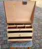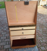 Der Koffer ist aus Imprägniertem 10mm Speerholz gefertigt, hat 3 Schubladen und ist abschließbar. Es passen Vorderlader-Pistolen mit einer Gesamtlänge von ca. 41cm liegend rein. Er hat verstärkte Metallecken und einen Tragegriff. Es passen alle Teile, die ein Vorderlader Schütze zu Schießen brauch rein, „Auch das Spektiv mit Tischstativ .“
