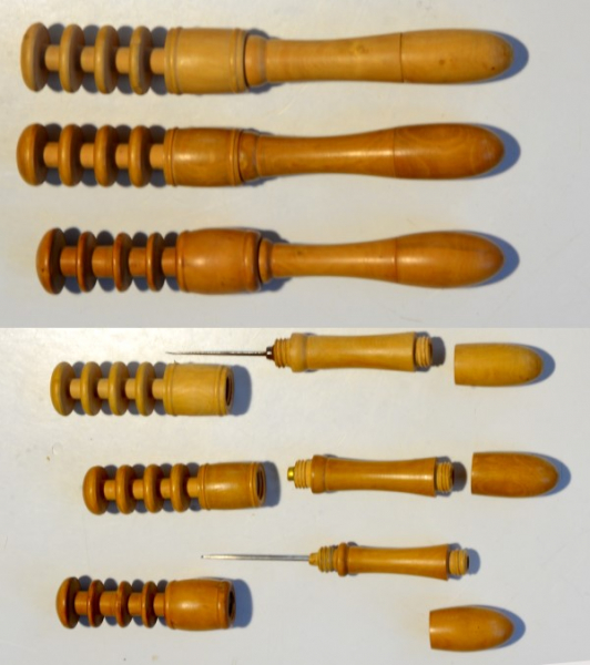 Aus Büchsenmacherbestand, ich interpretiere diese ähnlich wie Klöppel aussehende Drechselteile aus Model zu Wickeln von Papierhülsen oder Papierpatronen, innen eine Räumnadel, bzw. Entzündernadel falls es für Papphülsen gedacht ist, alle drei im Durchmesser leicht unterschiedlich, 18,2 mm, 19,3 mm und 19,9 mm, 13 bis 13,5 cm lang, bei einem fehlt die Nadel oder sie war nie vorhanden, Holz, sehr guter Zustand