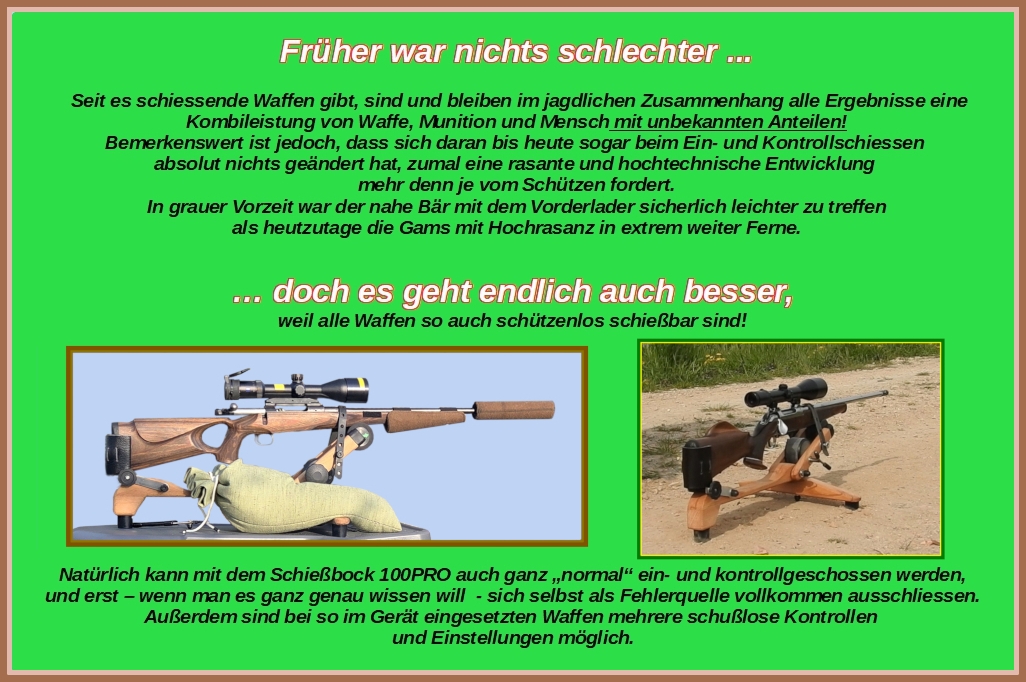 Erwähnenswert ist daher auch vorab, daß nach § 13 - Absatz 6 des Bundeswaffengesetzes das Ein- und Kontrollschiessen im Revier ohne eine Schußzahlbegrenzung erlaubt ist. Daraus ergibt sich also in Kombination mit dem Schießbock 100PRO eine vollkommene Unabhängigkeit von Schießständen und deren Öffnungszeiten.