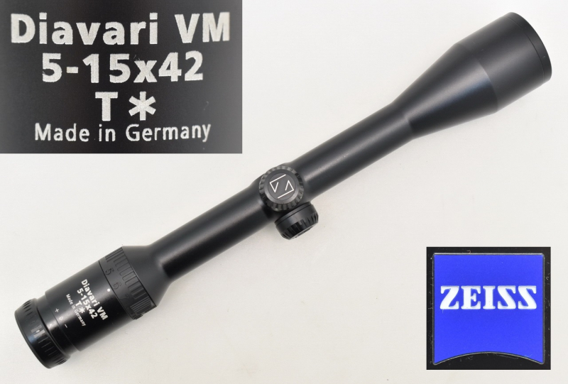 337mm lange und 450g leichte Zieloptik " Made in Germany " mit hoher Vergrößerung für weite Schüsse. Das ZEISS Diavari VM 5 - 15 x 42 mit Absehen - 4 - . Das Abs. liegt in der 2. Bildebene und wird nicht mitvergrößert. Die T* Mehrschichtvergütung ist Garant für höchste Lichttransmission. Stabiler, stickstoffgefüllter Rohrkörper aus eloxiertem Leichtmetall. Einfache Montagemöglichkeit durch die patentierte Zeiss Innenschiene. Das ZF präsentiert sich im BESTZUSTAND. Details siehe Bilder.