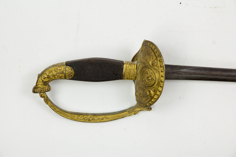 Degen, Frankreich, Restauration, wohl Stabsoffizier, Bronze vergoldetes Gefäß, verzierter Griffbügel in einer plastischen Sphinx endend, Stichblatt mit bekrönten bourbonischen Wappen, Fahnen und Trophäen, gebogener Griffabschluss mit Kriegstrophäen, fein gewaffeltes Ebenholz-Griffstück, Dreikantklinge mit Resten von Bläuungen, Gefäßbügel gelötet, sonst unberührter Zustand. L: 94 cm.