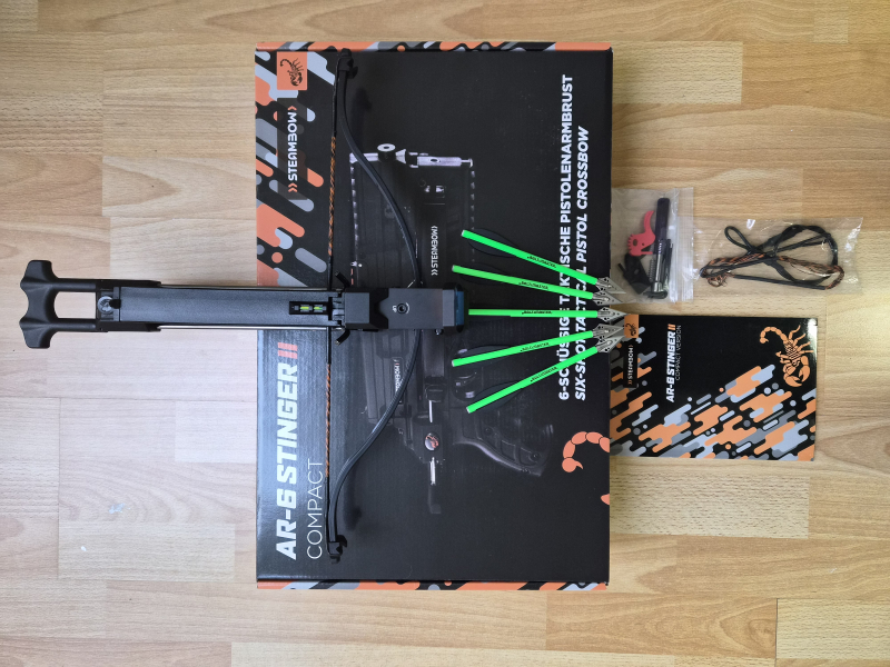 Ich biete eine neue Pistolenarmbrust für Sportschießen und Home Defence an. Der Komplettsatz besteht aus : AR 6 Stinger II - Compact mit 6 Pfeilen im Magazin, Steambow Wurfarm mit 75 lbs - 16 Joule, Tuningtrigger eingebaut (mit 3 Ersatztriggern), Vollummantelung des Spanngriffes, original Rändelschraube zum Schnellverschluss des Oberteils, Reddot mit Schutzkappe, -5- hochwertige Jagdpfeile von Bolt-Master mit Allunocken, -2- Sehnen und Spannseil, original Werkzeugsatz, OVP und Bedienungsanleitung.