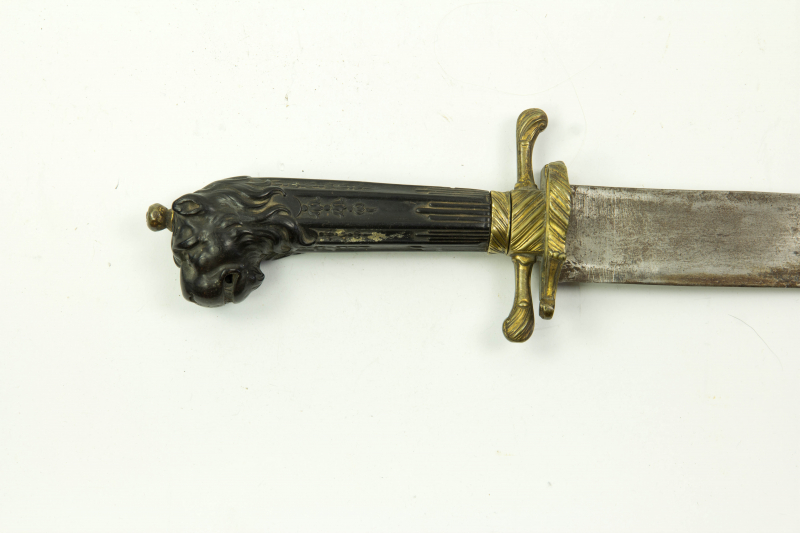 Hirschfänger, Frankreich, 2. Hälfte 18. Jh., Ebenholzgriff, hochwertig als Löwenkopf in Ornamenten auslaufend geschnitzt, vergoldete Bronze Parierstange, schräg rillenförmig verziert, breite Klinge mit Hohlschliff, unberührtes Stück, zu reinigen, sehr ausgefallen. L: 56 cm.