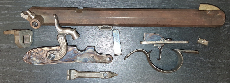 Kaliber / Cal.45 Vorderlader-Bausatz von DIKAR. Unvollständig! -ohne Schaft/Griffstück. Das Seitenschloss ist vollständig mit Feder etc.! Lauf ist nicht brüniert.