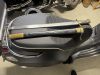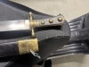 Weidmesser, Kantonale Ordonnanz 1838, für Scharfschützen KL 480mm, TL 510mm, gerade, einseitig geschliffene Klinge, runder Rücken. Parierstange aus Messing, nach aussen verdickt. Griffschalen aus Horn mit drei Messingnieten befestigt. Schwarze LederscheIDE