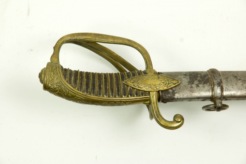 Ehren-Säbel, Frankreich, erstes Kaiserreich, 1804-1814, für Garde, Jäger, Offiziere (Generäle), Modell AN IX, Messinggefäß mit Resten einer Vergoldung, spitzovales Mitteleisen, auf der einen Seite mit Lorbeer- und Eichenlaub, auf der anderen Seite mit antikem Helm, Schwert, Trompete und Lanzen verziert, Griffkappe mit Lorbeer, Ornamenten sowie einer Kartusche mit Medusa dekoriert, (als Zeichen für Generäle im ersten Kaiserreich), Holzgriffstück mit Rochenhaut überzogen, gebogene Klinge mit zwei Hohlschliffen und Pandurenspitze, Stahlscheide, Gefäß etwas gedrückt, Stahlscheide porig, sonst absolut unberührtes Stück, Literatur: vergl. Les Sabre, Jean Lhoste, Seite 305 und Armes Blanches, Jean Lhoste Seite 69, L: 101 cm.