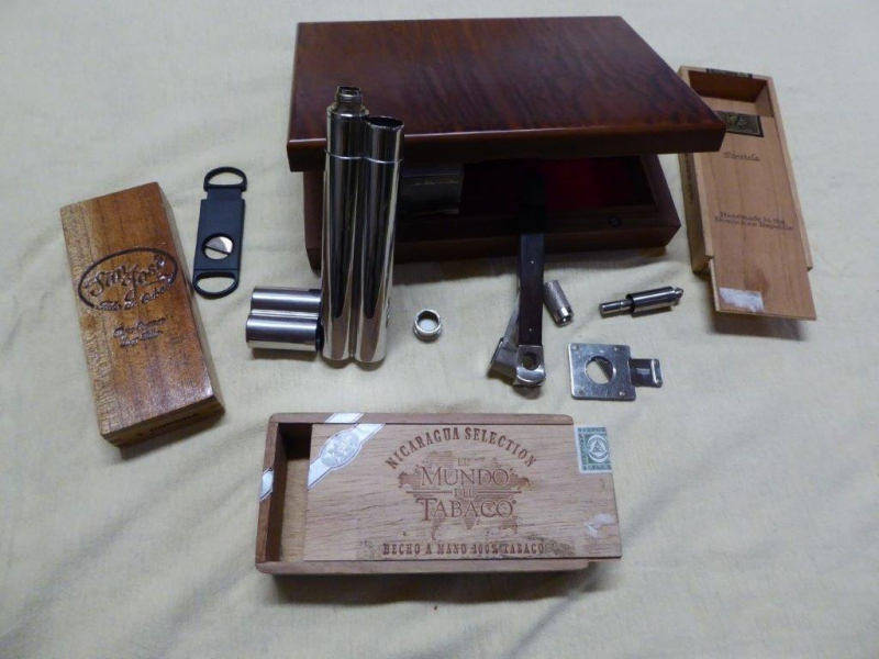 Zigarren Raucher Konvolut 10 Teilig.-----1e Humidor Holzschachtel aus edlem Holz , l ca. 74 cm , b ca. 20 cm , h ca. 5 cm mit Magnetverschluss ------ ,-----3 St leere Zigarren Holzschachteln,,-----2e Edelstahl Behälter auf einer Seite für die Zigarre auf der anderen Seite für ein edles Getränk,.-----Rest siehe Bilder.-----Alle Angaben ohne Gewähr und Rückgabe, da Privatverkauf.