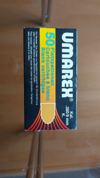 Aus Nachlass kaufen Sie hier 50 Stück bestens erhaltene Umarex Knallpatronen im Kaliber. 380/9 mm k. Insgesamt sind 12 Packungen vorrätig. Die Patronen scheinen ordentlich gelagert zu sein. Gerne beantworte ich Ihre Fragen! Versand erst nach Zahlungseingang und Altersnachweis! Kein Versand ins Ausland!!!