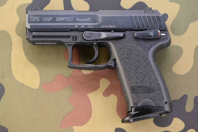 Markenlogo, Seriennummer, Modellbezeichnung „HK USP COMPACT“, „Made in Germany“, bundesrepublikanischer Beschuss, datiert "KK" = 1999, Kaliberangabe „9 mm x 19“.