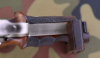 Originales mattiertes Stainless-Finish zu ca. 99 % perfekt werksfrisch erhalten. Nur an der schmalen Vorderseite des Griffs, ganz unten, finden sich ein paar stecknadelkopfkleine Pünktchen bzw. Spuren von weggeputzten feinen Flugrostsprenkeln, wo einmal Reste vom Handschweiß etwas zu lange wirken durften, bis wieder einmal ein Öllappen vobeikam: Keine Krater oder Narben, nur kleine nicht fühlbare Pünktchen siehe Bild Nr. 6!