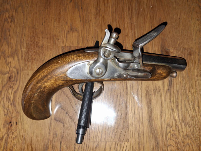 Ich biete hier einen seltenen Steinschloss Derringer im Cal.41 (10.2mm ) von AMR an. Er ist voll funktionfähig und mit Beschusszeichen. Nur der Batteriedeckel müsste neu gehärtet oder aufgekohlt werden. Alle Anbauteile sind hier aus Stahl und nicht aus Messing. Ein Ladestock ist auch vorhanden. Für sein alter ist der Schaft in einem sehr guten Zustand. Das Schloss ist mit einer richtigen strammen Schlagfeder versehen und nicht wie die Philadlphia Derringer mit einer lahmen Spiralfeder. Der Lauf ist Glatt. Schauen sie die Bilder, sie sind Bestandteil der Auktion.