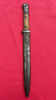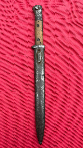 Preußisches Bajonett M 1884/98 n.A., Hersteller: Möve-Werke Walter & Co. Mühlhausen in Thüringen, Klingenrücken: W15, Klinge mit eckigen Hohlkehlen, Holzgriffschalen und rundem Reinigungsloch, Druckknopf gängig, Seltenes Bajonett