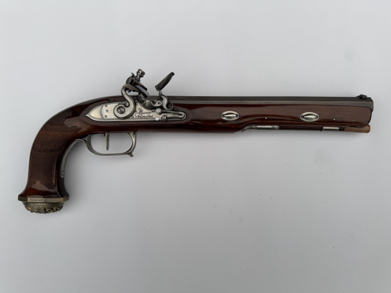 Angeboten wird ein auf 100 Stück limitiertes Sondermodell eines Nachbaues einer Steinschlosspistole vom Luxus Büchsenmacher Nicolas-Noël Boutet mit bräuniertem Lauf und Vollschäftung.