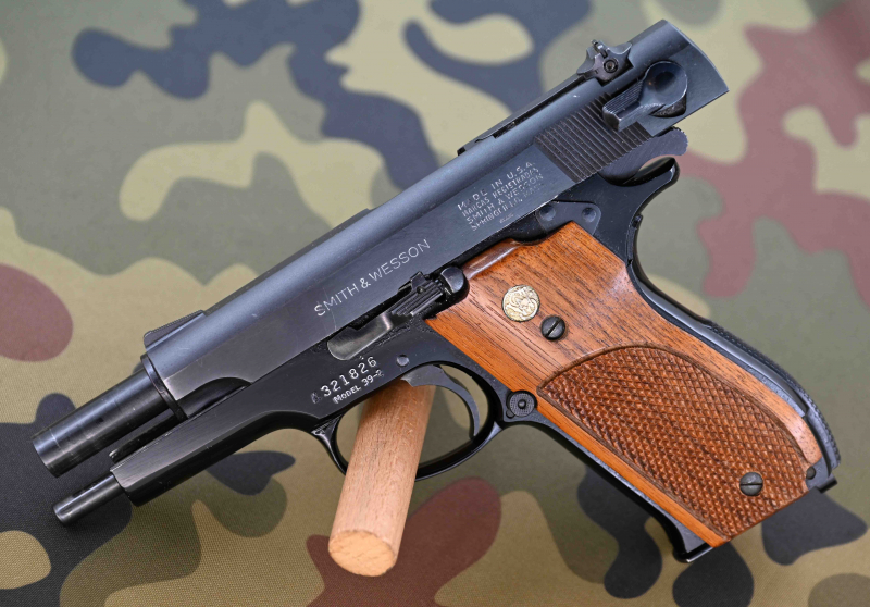 Markenlogo „S & W Trademark“ auf Rahmen rechts, deutscher Beschuss, „Pat´s Pending“, Hersteller „Made in USA. Marcas Registradas Smith & Wesson, Springfield, Mass.” Seriennummer "A321826" und Modellbezeichnung "Model 39-2" links auf dem Aluminiumgriffstück, oberhalb des Abzugbügels. Gültige deutsche Beschusszeichen aus dem Jahr 1977. Kaliberangabe "9 mm P" auf dem Patronenlager.