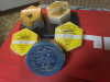 Es sind 3 volle Dosen und eine angefangene von den gelben und 1 geöffnete Dose von den Blauen.