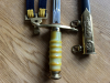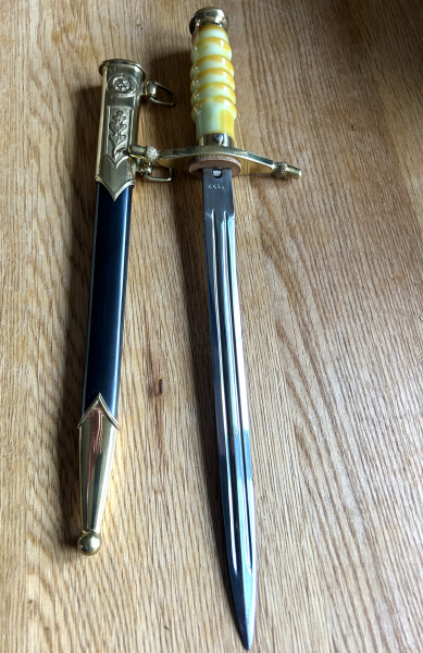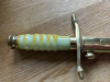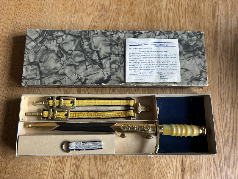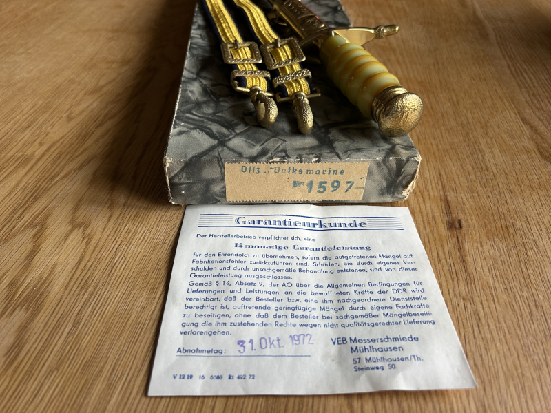 Verkaufe diesen Dolch der Volksmarine mit der Nummer 1597. Er ist gut erhalten und technisch in Ordnung. Im Umfang sind auch der nummerngleiche Karton, das Gehänge, die Schlaufe und die Garantieurkunde enthalten. Die Klinge trägt das Mühlhausener Logo.