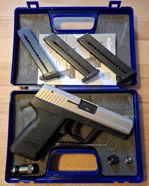 Es wird eine Schreckschusspistole Röhm RG 96 Nickel in gutem, leicht gebrauchten Zustand mit viel Zubehör versteigert. Beschuss von 2016. Ich habe sie selbst vor ein paar Jahren in diesem Zustand für die Sammlung und Silvester gekauft, aber dann doch nie benutzt. Man nimmt halt irgendwie doch immer wieder die gleichen paar Geräte her. Von außen leichte Kratzerchen am Lauf im Auswurffenster sichtbar, siehe Foto, kommt wohl vom Zerlegen.
