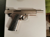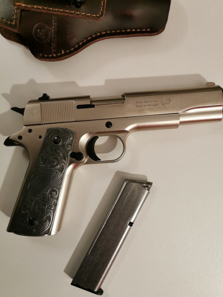 ich biete aus meiner Sammlung die Pistole IWG GOVERNMENT im Kaliber 9 mm P.A.K., vernickelt. Die Waffe wird ohne Originalverpackung geliefert, und der Abschussbecher fehlt. Das Originalmagazin und ein Lederholster sind enthalten. Sie funktioniert einwandfrei und ist in gutem Zustand. Es hat Griffe aus Metall im arabischen Stil. Eine wirklich schöne Waffe. PTB-Nr. 668