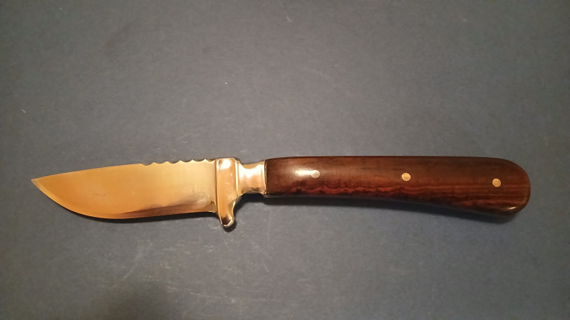 Biete aus meiner Sammlung ein sehr handliches, in Handarbeit gefertigtes Jagdmesser an. Klingenlänge ist 6,8 cm, GL ist 18 cm. Der Klingenstahl ist 440C, rasierscharf abgezogen. Der Griff