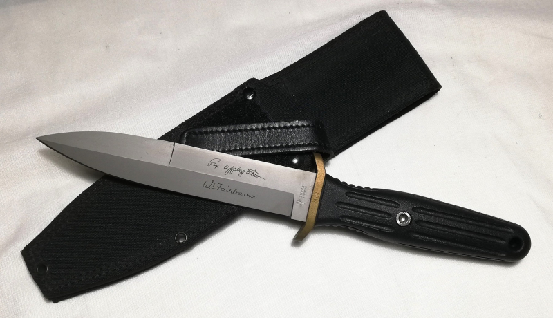 Wie abgebildet, in einwandfreiem Zustand. Böker Solingen Messer, Stücknummer 2489. Die Klinge trägt die Gravur „Roy Applegate“ W.R. Fairbairn. Mit Originalscheide.