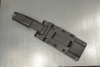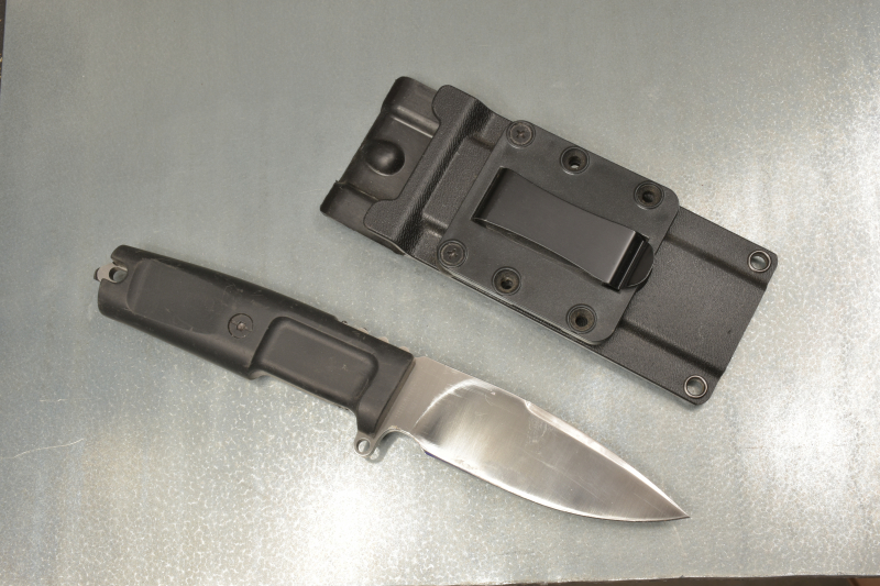 Sie bieten auf ein Kampfmesser in schwerer Qualität. Die Klinge hat ein seidenmatt-geschliffenes Finish, der Griff besteht aus hartgummiartig schwarzem Kunststoff. Die Scheide aus schwarzem Kydex ist mit einem stählernen Clip zum Tragen am Hosenbund, Gürtel oder der Jackentasche versehen. Das Messer sitzt stramm in der Scheide, sodass es auch mit dem Griff nach unten hängend getragen werden kann.