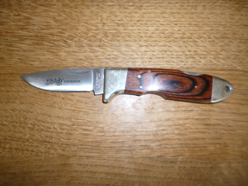 C. Jul. Herbertz Taschenmesser feststellbar, nur einmal benützt, Rostfrei 440 Messer-Nr. 202611, Klingenlänge 8 cm, Grifflänge 11,5 cm, Klingenstärke 2,8 mm, Griff aus Palisanderholz, Neusilberbacken und Abschluß mit Kordelbohrung, stabiles Messer das satt in der Hand liegt