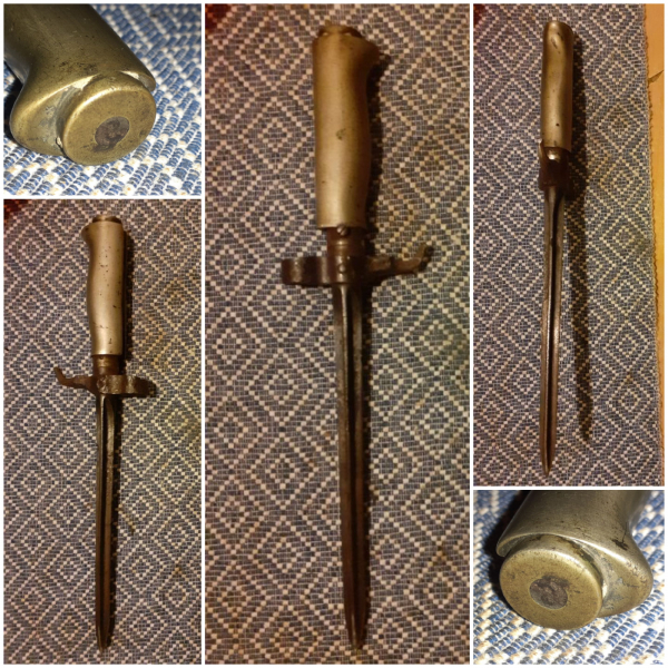 Altes Messer, hergestellt aus einem französischen Beuteseitengewehr,eventuell als Grabendolch genutzt.Schöne Stempel.