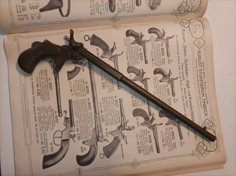 Massiver Messing abguss einer Flobert-Salon Pistole wie sie im Stukenbrok Katalog von 1911 beschrieben wird. Habe ich so noch nie Gesehen, und gehe von unikaten aus ( es existiert noch eine die in der Aukt. Nr.20191674 angeboten wird). Die Pistole besteht wie die Erste wirklich nur aus vollmaterial, sie hat keine bewegliche Teile und auch keine Laufbohrung, alles ist einfach nur aus einem Guss. Der Abguss zeigt das wohl ein Original als vorlage gedient hat. Privatverkauf keine Garantie oder Rücknahme
